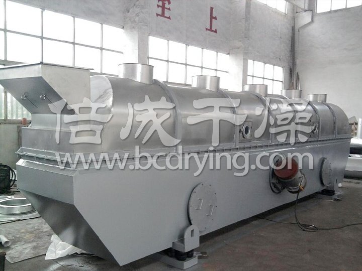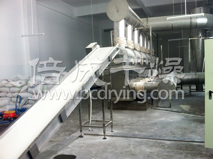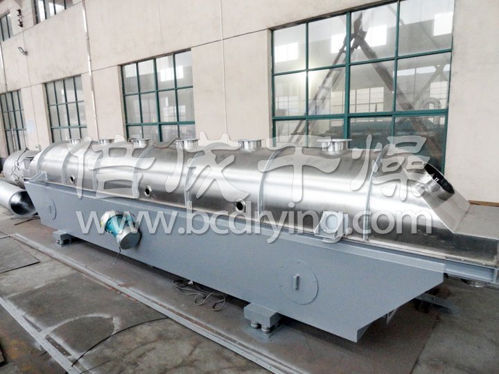 物料自進料進口進入機內(nèi),在振動力作用下,物料沿水平面流化床拋擲,向前連續(xù)運動,熱風(fēng)向上穿過流化床同濕物料換熱后,濕空氣經(jīng)旋風(fēng)分離器除塵后由排風(fēng)1:3排出.干燥物料由排料進口排出。