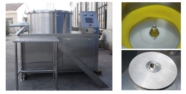 本機(jī)是通過設(shè)置旋轉(zhuǎn)離心盤、鼓風(fēng)機(jī)、氣動噴槍,將濕顆粒制成美麗的球丸。將前道工序做成的濕顆粒投入旋轉(zhuǎn)離心盤內(nèi),啟動鼓風(fēng)機(jī)后再將旋轉(zhuǎn)離心盤啟動,使?jié)耦w粒受到環(huán)隙空氣浮力、旋轉(zhuǎn)離心力、自身重力作用,呈環(huán)周繩股狀運(yùn)動,從而形成真球度極高的球丸。旋轉(zhuǎn)盤自動升降,使物料的收集和制丸速度大大提高。
